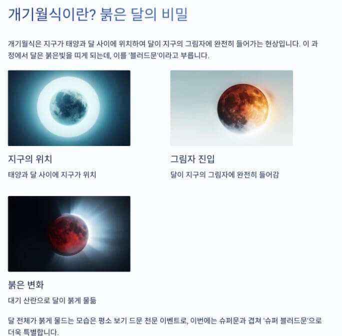 개기월식은 지구가 태양과 달 사이에 위치하면서 지구의 그림자가 달을 완전히 가리는 현상입니다. 평소 보기 힘든 천문현상으로, 맨눈으로도 관찰할 수 있어 매년 많은 분들이 관심을 갖고 있습니다.